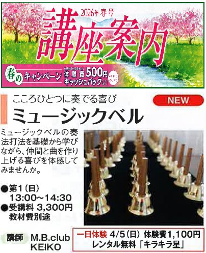 そして、10年。活動を通じて得てきたテクニックはもちろん、こころをひとつにして奏でることのよろこびを、多くの人に伝えられたら…。そんな思いでスタートさせたレッスンスタジオ、それが「M.B.clubミュージックベルスタジオ」です。 ここで多くの人と出会い、ミュージックベルの素晴らしさを、さらに広げていけたらと思います。